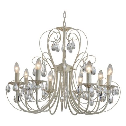 metalnim elementima u belo zlatnoj boji. Stakleni ukrasi dodatno pojačavaju sofisticiranost i reflektuju svetlost na prelep način, stvarajući prijatan i topao ambijent. Opremljena je sa E14 grlom koje omogućava prijatno osvetljenje u prostoru. Izrađena je od metala i stakla u dimenziji od 370x210mm što je čini idealnim izborom za manje enterijere, hodnike, ili prostore u kojima je potrebno postaviti akcenat na detalje.