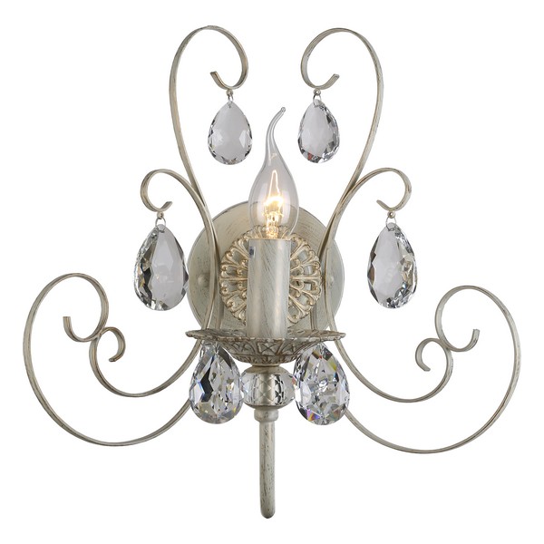 metalnim elementima u belo zlatnoj boji. Stakleni ukrasi dodatno pojačavaju sofisticiranost i reflektuju svetlost na prelep način, stvarajući prijatan i topao ambijent. Opremljena je sa E14 grlom koje omogućava prijatno osvetljenje u prostoru. Izrađena je od metala i stakla u dimenziji od 370x210mm što je čini idealnim izborom za manje enterijere, hodnike, ili prostore u kojima je potrebno postaviti akcenat na detalje.
